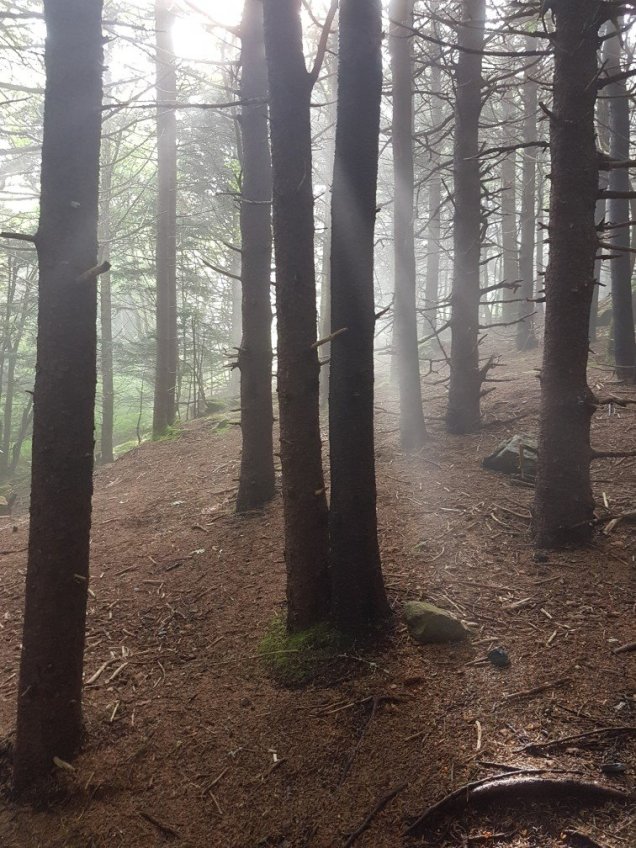 Auf dem ehemaligen Fuhrweg machten wir uns auf den Weg. Nach dem gestrigen Regen war es nun sehr dunstig und feucht. Nicht lange nach dem Start lief Monk mit dem Kopf gegen einen tiefhängenden Ast und ging kurz in die Knie. Der Zusammenprall war so heftig, dass er leicht am Kopf blutete. Kurz darauf rutschte ich aus und machte Bekanntschaft mit den spitzen Felsen. Doppelt Autsch!