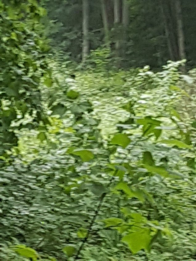 Etwa sieben Meilen vor dem Ziel ging eine Stromleitung durch den Wald, darunter war gerodet, wobei Büsche und junge Baumtriebe schon wieder relativ hoch standen. Ich hatte den Rucksack kurz abgesetzt und wollte gerade weitergehen, als ich etwas Schwarzes im Hang erblickte. Könnte das ein Bär sein? Ich schaute weiter, nichts bewegte sich. Also Fehlanzeige. Doch halt, auf einmal eine Bewegung. Ja, es war ein Bär, der sich dort aufhielt. Ich schaute ihm etwa 5 Minuten zu, bis er im Wald verschwand. Das Foto ist grauenhaft schlecht, der schwarze Fleck könnte irgendwas sein Aber Handy Kameras auf grosse Distanzen, und dann noch im Starkregen, sind nicht viel wert.