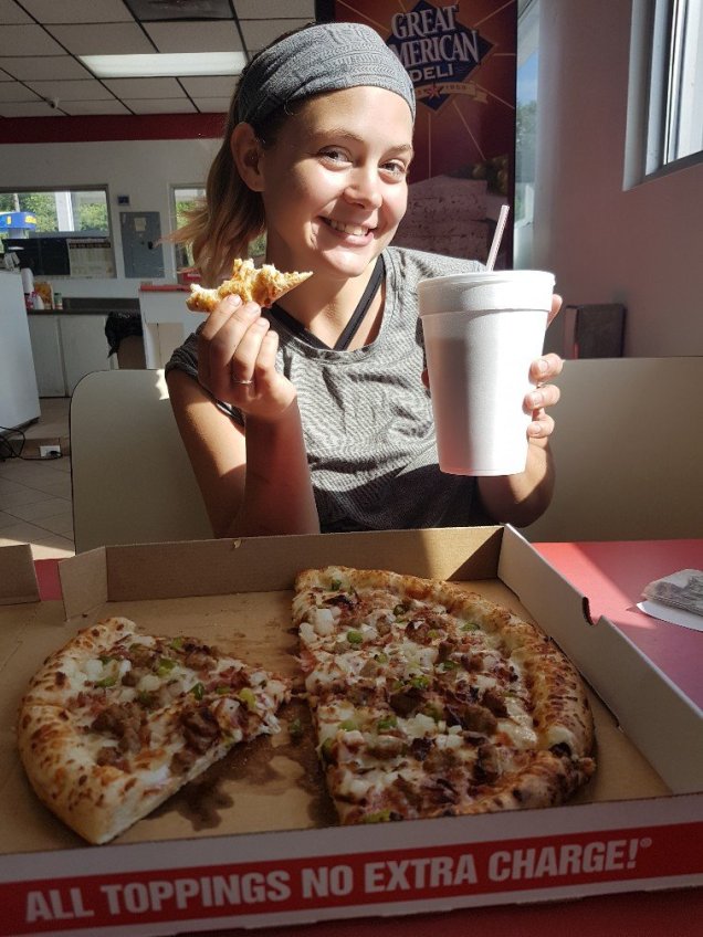 Wir liefen zur zweiten Tankstelle, das mexikanische Restaurant war aber gerade heute ausnahmsweise geschlossen. Gegenüber war ein Restaurant, dieses hatte um 15h00 geschlossen, es war 15h10! Also zurück zur ersten Tankstelle. Die Kassiererin machte ein Gesicht wie sieben Tage Regen. Auf meine Frage, ob es noch Pulled Pork habe, kam die Antwort: Nein, am Sonntag gibt es kein Pulled Pork. Mit viel Überzeugungsarbeit brachten wir sie soweit, dass sie uns eine frische Pizza für zwei macht. Wir besorgten noch zwei, drei andere Dinge. Als wir bezahlen wollten, sprach uns Ashley aus Pennsylvania an.